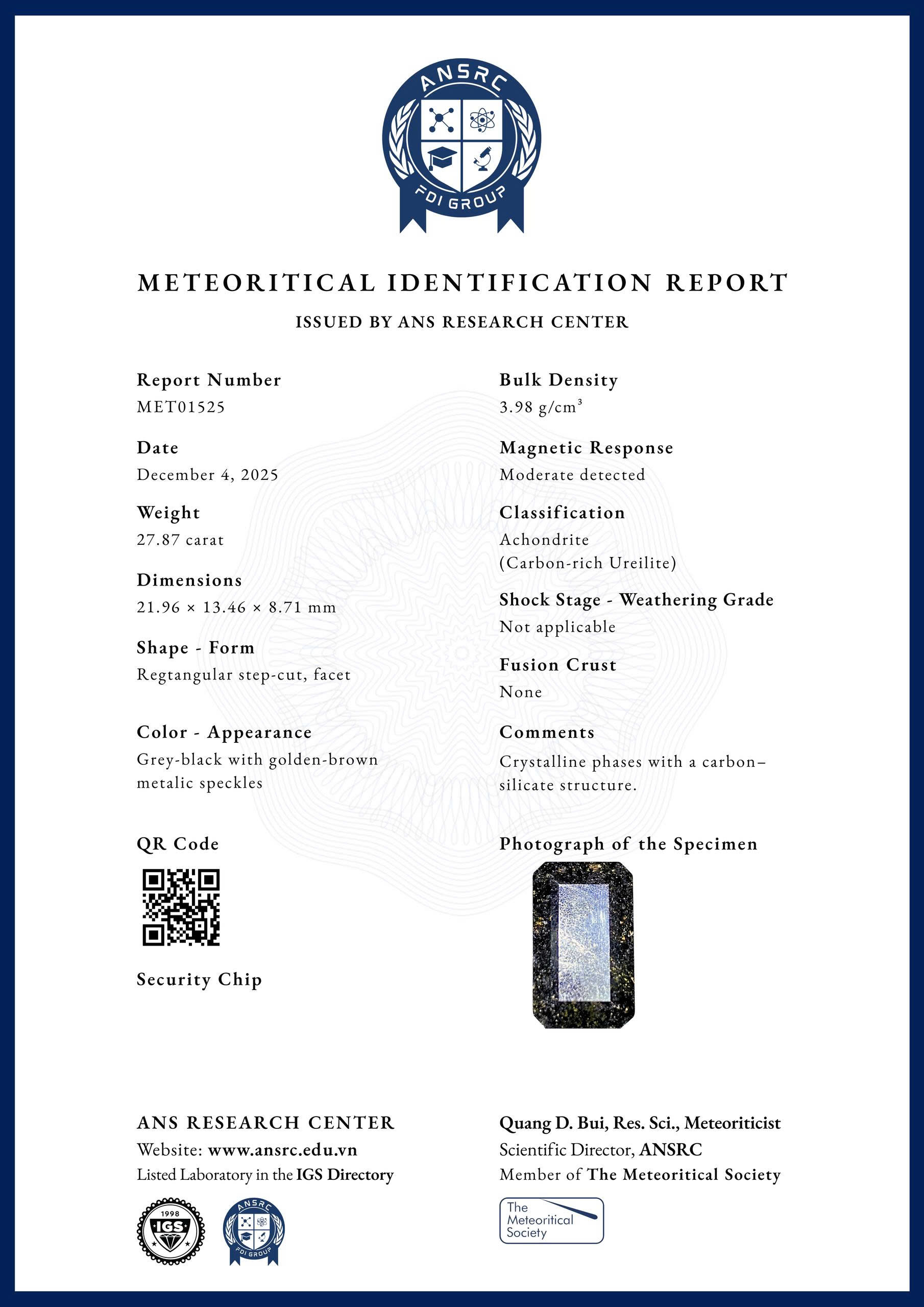 Achondrite – Carbon-Rich Ureilite is a rare type of stony meteorite that has undergone intense thermal metamorphism, has a large crystal structure (without chondrules), and contains a significant amount of carbon, usually in the form of graphite and diamond.